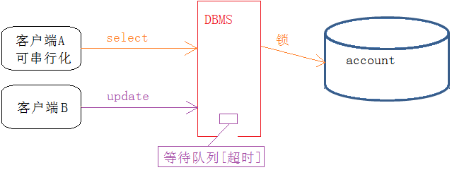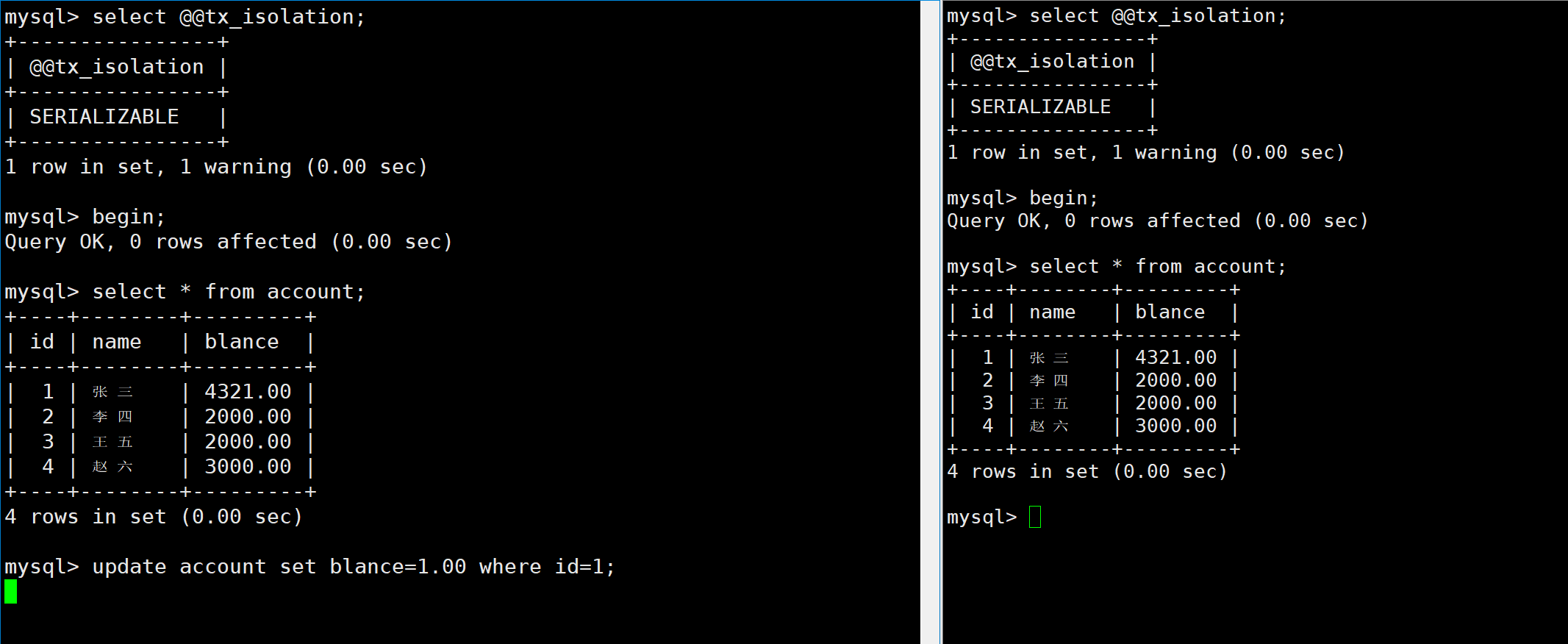 终端A和B先后分别开启事务,二者同时查询数据的时候不会串行化,如果此时终端A的事务执行修改操作,那么就会阻塞住: