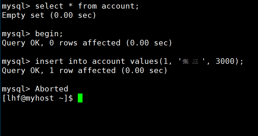 终端A,使用begin开启事务,然后向表中插入一条数据,未提交事务就终止了该终端: