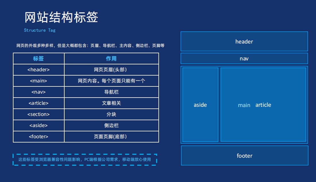 1.网页结构标签(H5新增,移动端完全可以放心大胆的使用,但是PC端的浏览器需要考虑兼容性的问题)