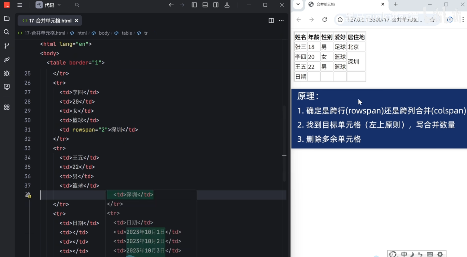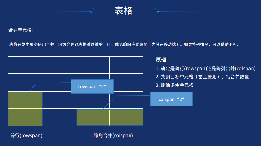 跨行和跨列合并,跨行的要写在上边的单元格,跨列要写在左边的单元格,例如,写colspan = "2"表示跨列合并两个单元格,然后删掉多余的单元格