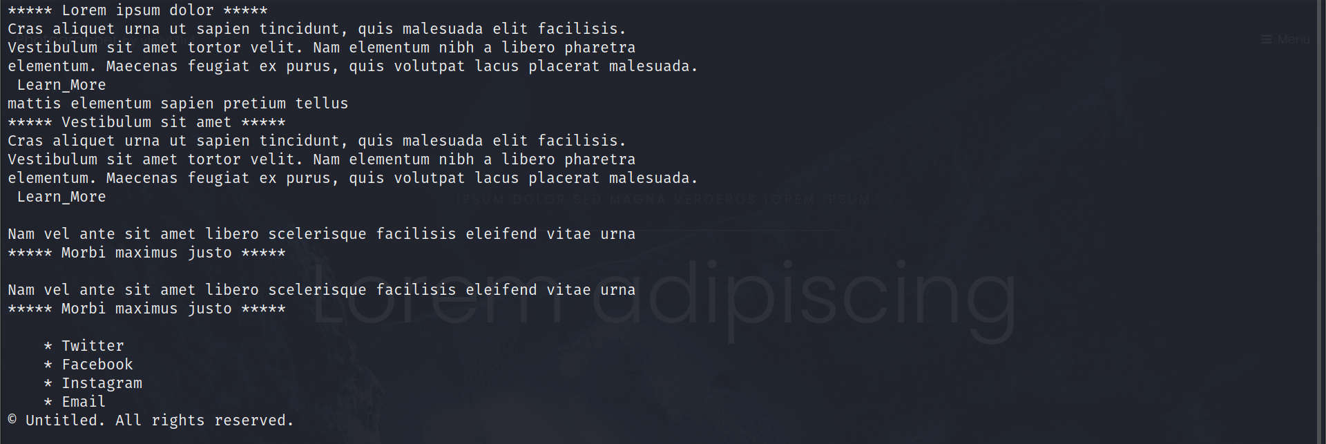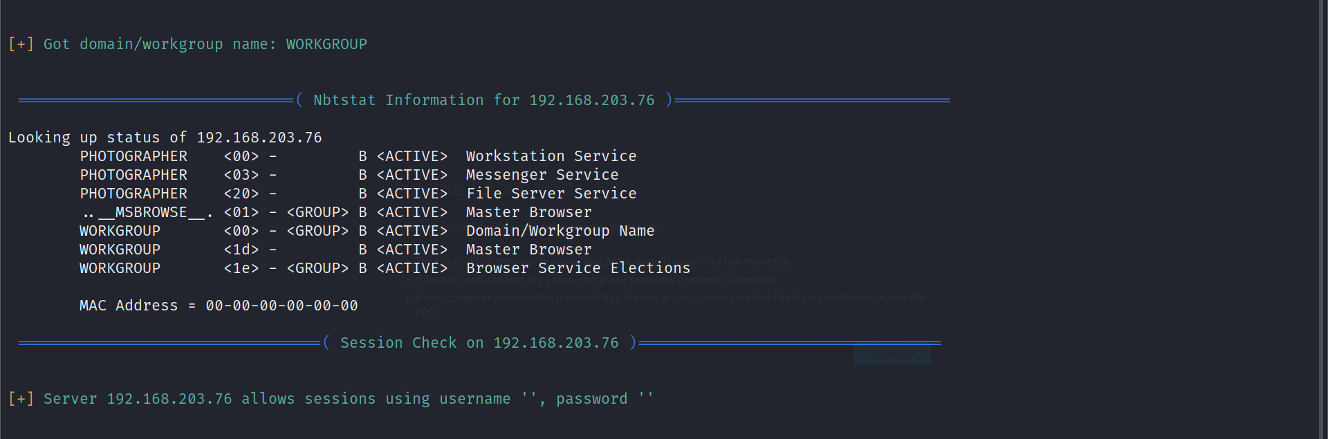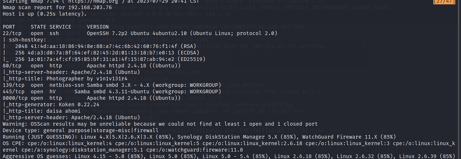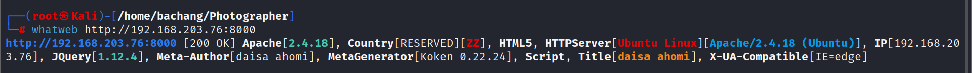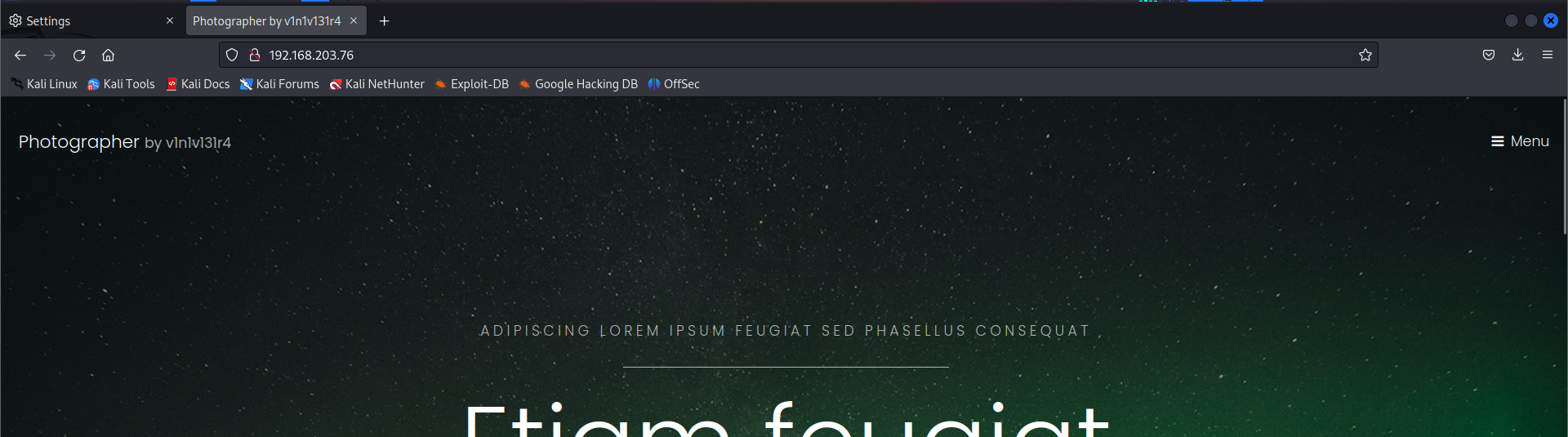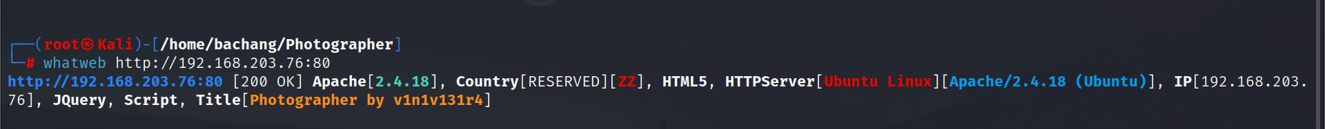 http://192.168.203.76:80 [200 OK] Apache[2.4.18], Country[RESERVED][ZZ], HTML5, HTTPServer[Ubuntu Linux][Apache/2.4.18 (Ubuntu)], IP[192.168.203.76], JQuery, Script, Title[Photographer by v1n1v131r4]