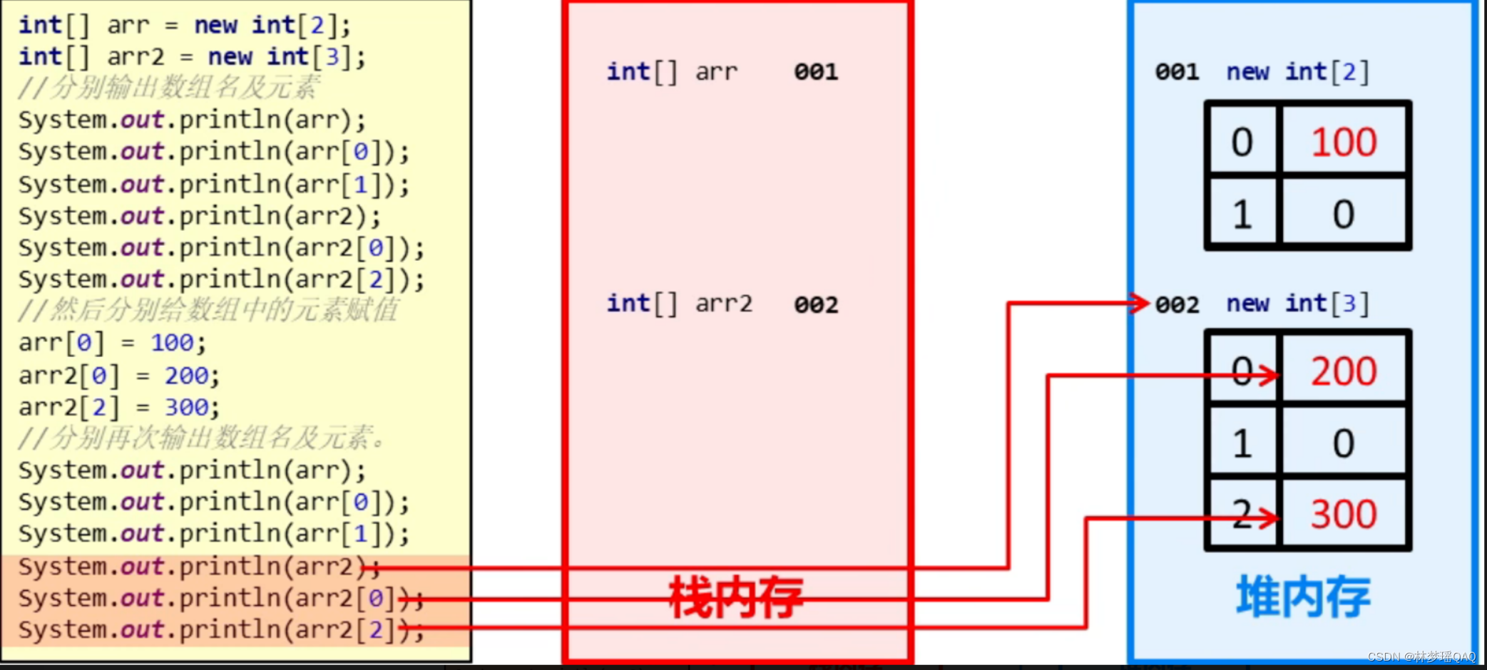 静态初始化:初始化时指定每个数组元素的初始值,由系统决定数组长度