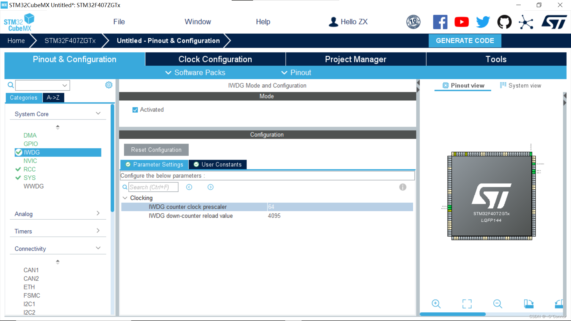 在cubemx中,只需要开启IWDG,并配置预分频系数和递减计数值即可: