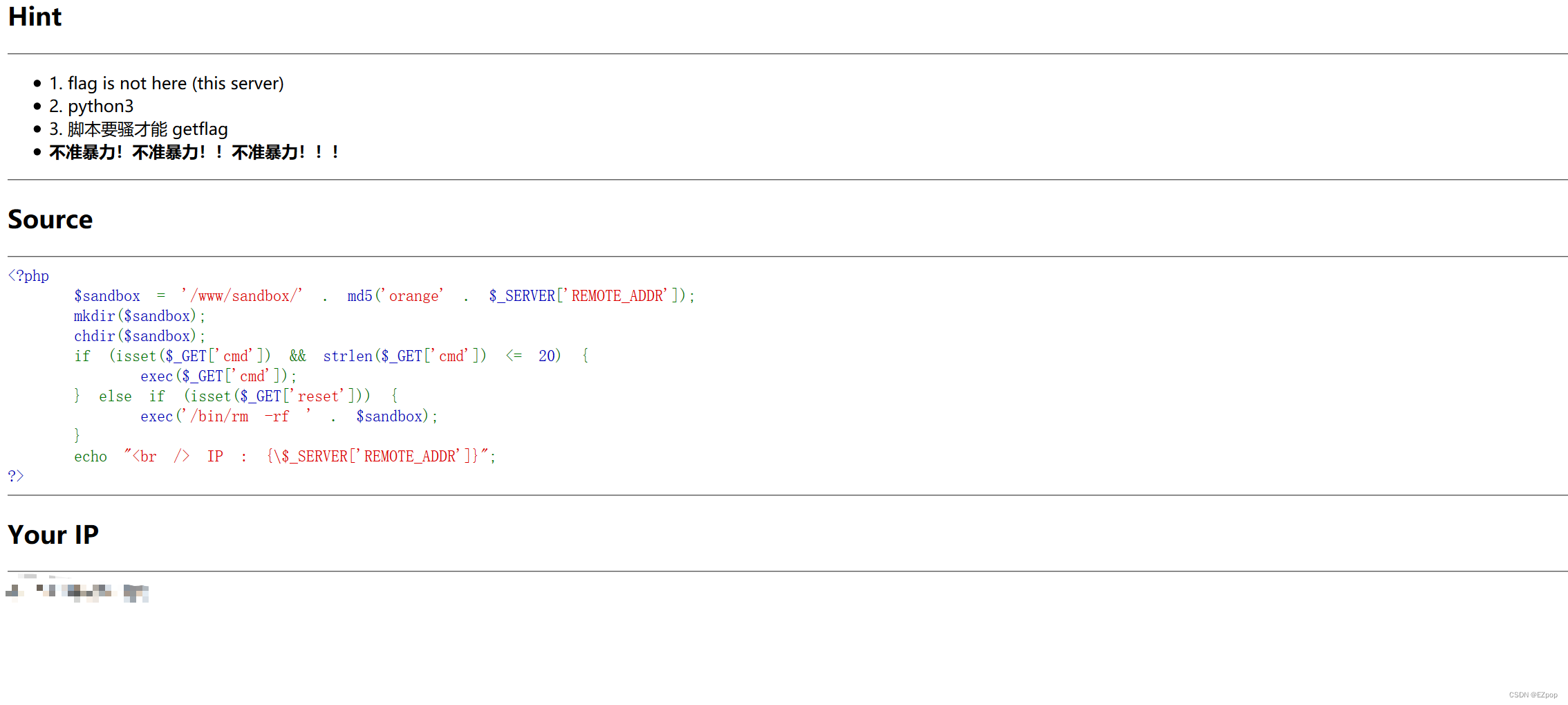 RCE命令执行和代码执行 RCE为两种漏洞的缩写,分别为Remote Command/Code Execute,远程命令/代码执行。代码执行简介因为需求设计,后台有时候需要把用户的输入作为代码的一部分进行执行,也就造成了代码执行漏洞。通过代码注入或远程代码执行(RCE),攻击者可以通过注入攻击执行恶意代码、向网站写webshell、控制整个网站甚至服务器。在某些情况下,攻击者可能能够从代码注入升级为命令注入。危险函数eval() //把字符串作为PHP代码执行assert()