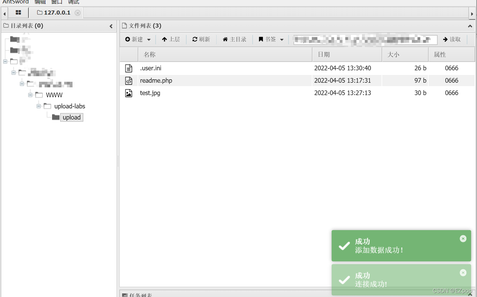 我们可以用readme.php来包含上传的小马图片连接蚁剑成功