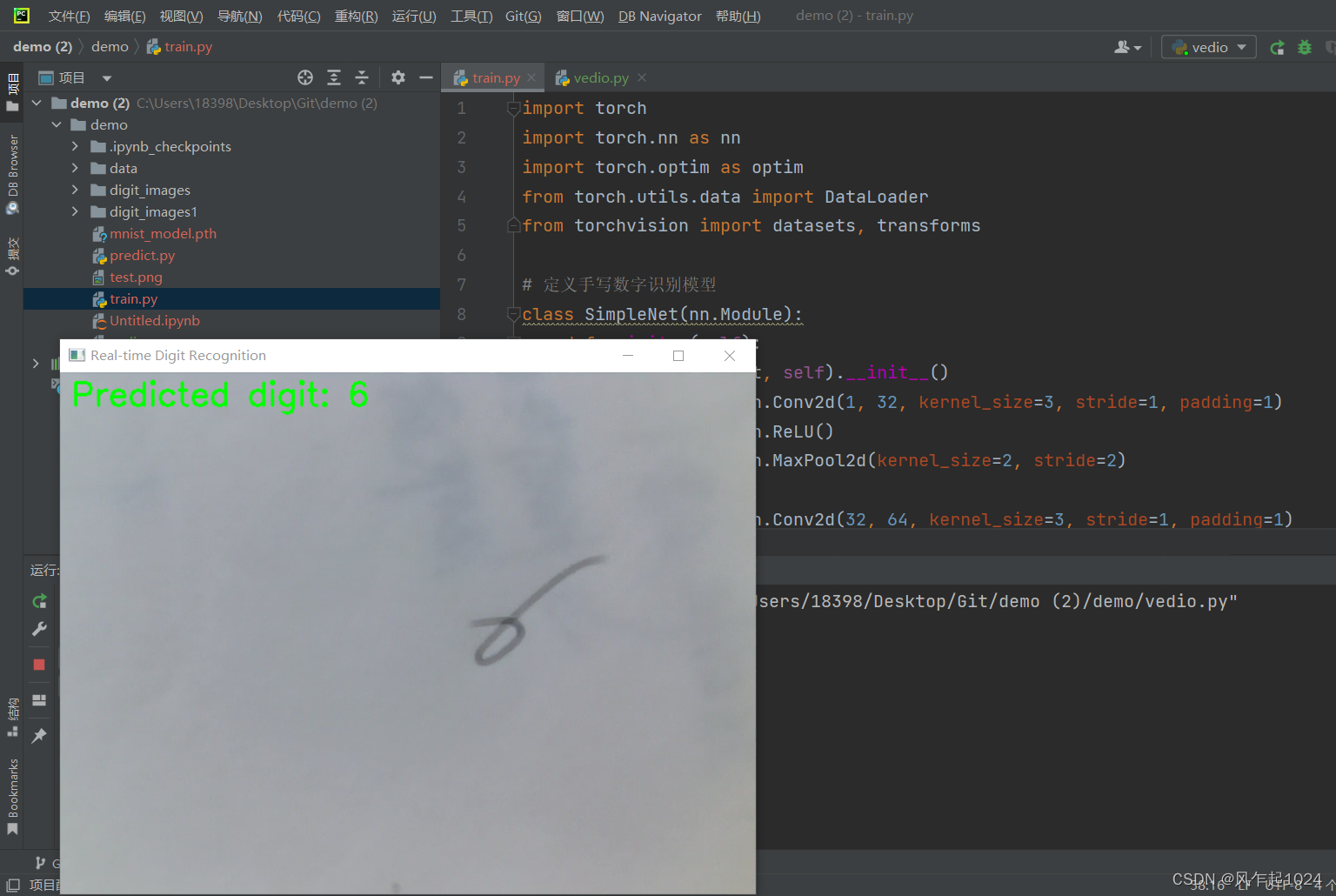 手写数字识别----实时识别 我们选择用深度学习训练手写数字识别。主要是因为深度学习模型能够自动学习数据中的特征,而不需要手动设计特征提取器。对于手写数字识别,底层可能学到笔画的基本特征,而高层次则可能学到数字的整体形状。可以使用在大规模数据上预训练的模型,在相对较小的手写数字数据集上进行微调。当然,它还能做些更有意思的事情,下期做手写电话号码识别。