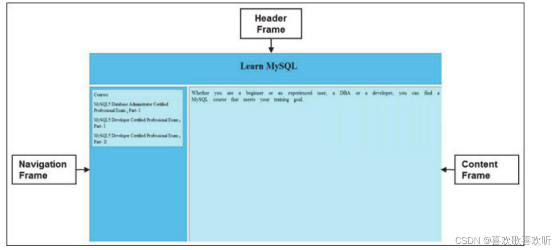 在上图可以看出页面分为三个部分,分别对应三个框架,每个框架也可以看成一个单独的web页面。