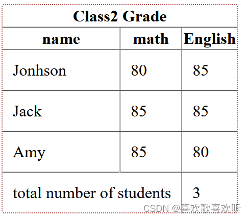 | border | 它用于设置表格边框的样式、宽度和颜色。它与< TABLE>、< TH>和< TD>标记一起使用。 | table{ border: dotted 1px brown; }对应显示为虚线边框,边框设置为1像素,边框颜色为棕色 |