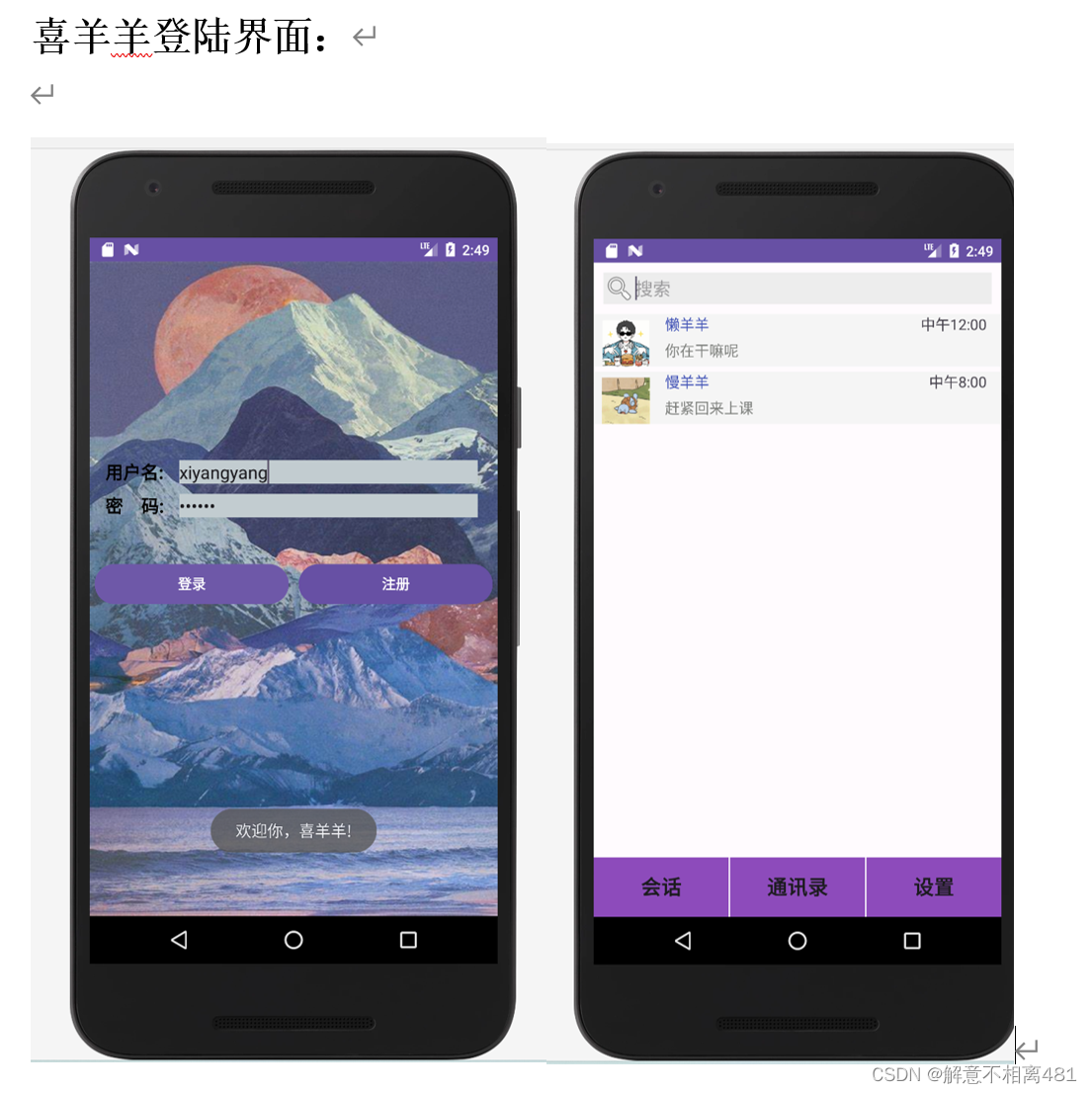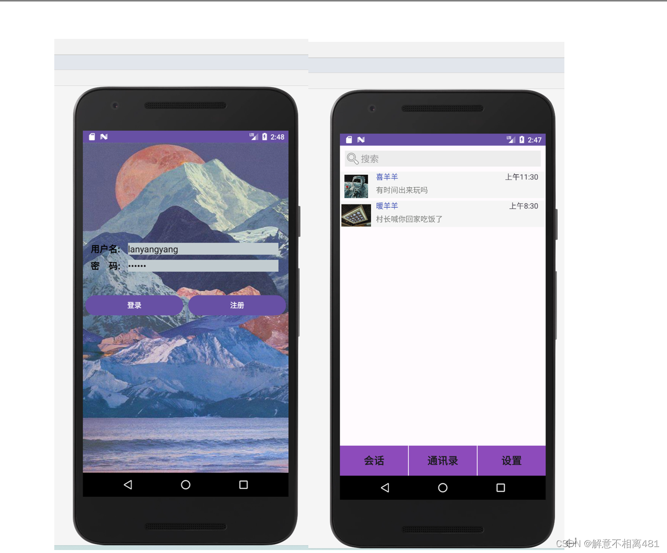 实验步从登陆注册界面跳转到APP主界面。点击不同的RadioButton上对应不同的Activity。