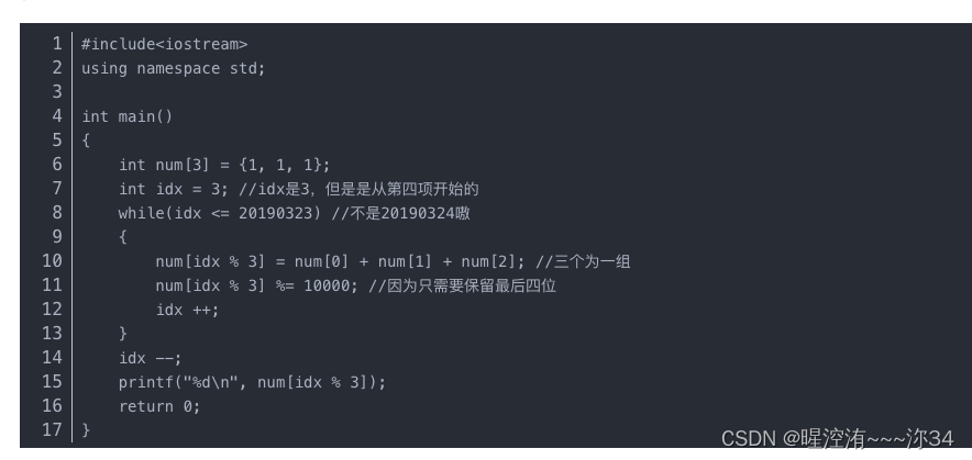 题目描述:给定数列1,1,1.....,从第四位开始,后面的数就是前三项之和,求2019324项数的后四位数;