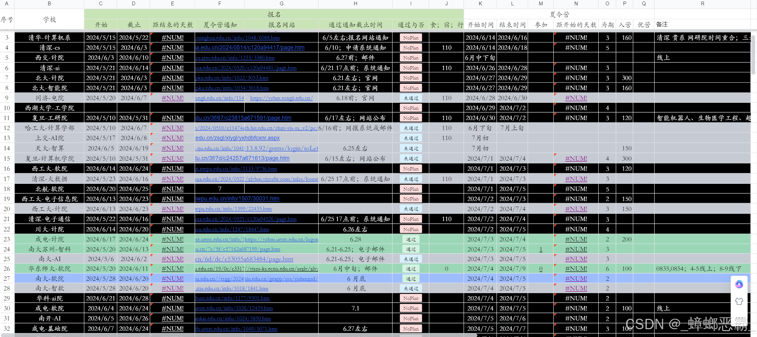 1. 夏令营参加了南软、武大cs、中大cs、科大cs,所以这几所院校搜集的资料相对较多;2. 部分院校(尤其是“考量”部分)具有参考价值。包含笔者个人在报名、选择时候的考量(比如一个学校只能报一个学院、或者两个学校参营冲突),优营率、考核内容、考核难度、优营效力、培养方案等等都可以作为博弈的参考。