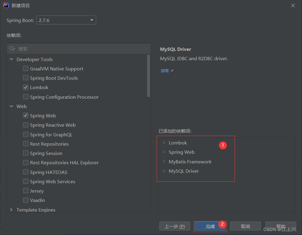 首先选择Developer Tools选择Lombok,再点击web选择Spring Web,以及SQL下的Mybatis Framework和MySQL Driver