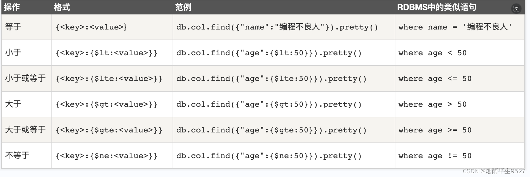 类似SQL语句为:'where age >50 AND (name = '编程不良人' OR name = 'MongoDB')'