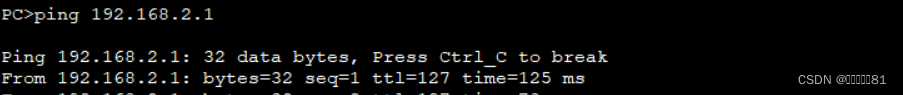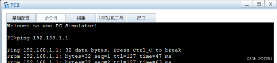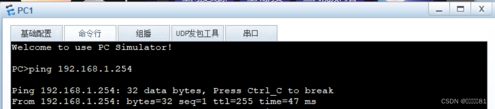 此时vlan1的主机能ping通三层交换机串口1的地址