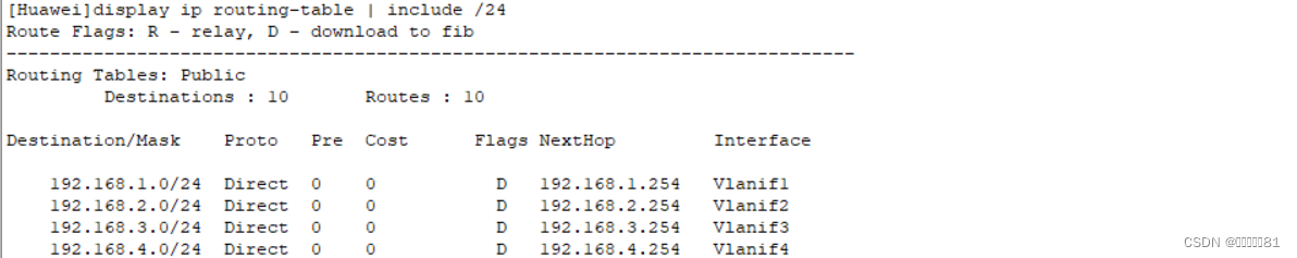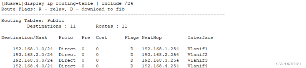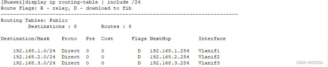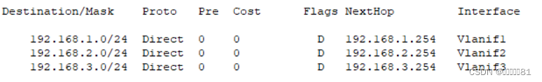 查看三层交换机的路由表(实现了路由器的路由表功能)
