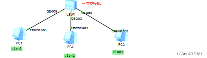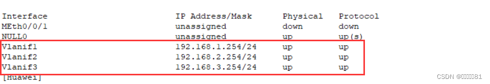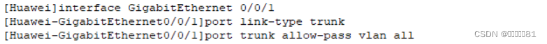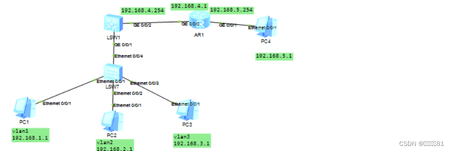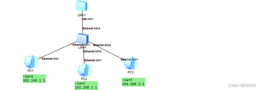 只有主机1能ping通三层交换机,其余主机都不能ping通,需要在二层交换机和三层交换机之间设置中继链路,让不同的vlan ping三层交换机(如果串口配置错误,需要clean清空串口然后undo shutdown重启串口)