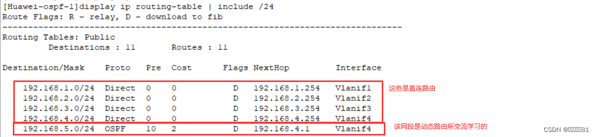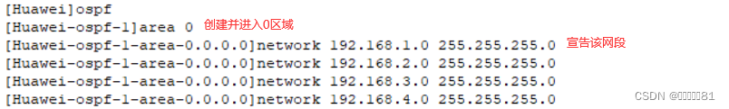 动态路由协议OSPF(开放式最短路径优先):动态路由能够相互学习,自动指定下一跳(适合复杂度大型网络),可以划分多个区域,第一个区域为0,宣告(自身可直连的网段)能去的网段