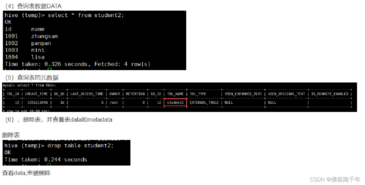 外部表:删除表会删除表的元数据(metadata),但不会删除表数据(data)。