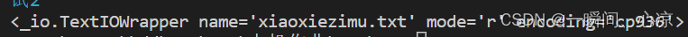 可以看见会出现各种参数,name指的是文件名,mode指的是方式,这里用的是r(read),最后还有个encoding='cp936',这是在这里的代码编译格式是cp936。