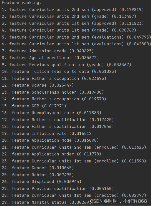 print("Feature ranking:")打印输出特征重要性的排名信息。 -
