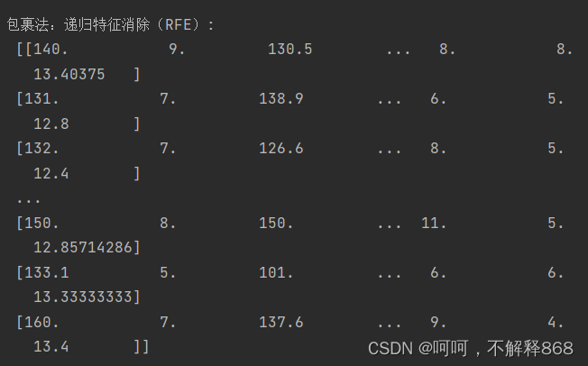 print("\n包裹法:递归特征消除(RFE):\n", X_rfe)打印输出经过递归特征消除后的特征矩阵X_rfe。