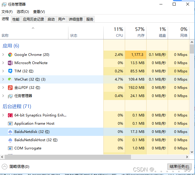 如下图所示,在 windows 中通过查看任务管理器的方式,我们就可以清楚看到 window 当前运行的进程(.exe 文件的运行)。