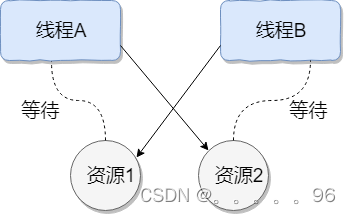 如下图所示,线程 A 持有资源 2,线程 B 持有资源 1,他们同时都想申请对方的资源,所以这两个线程就会互相等待而进入死锁状态。