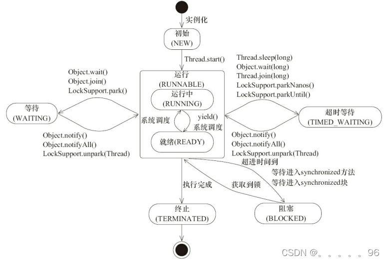 由上图可以看出:线程创建之后它将处于 NEW(新建) 状态,调用 start() 方法后开始运行,线程这时候处于 READY(可运行) 状态。可运行状态的线程获得了 CPU 时间片(timeslice)后就处于 RUNNING(运行) 状态。