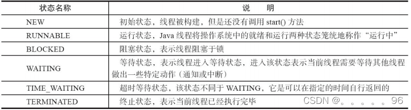 当线程执行 wait()方法之后,线程进入 WAITING(等待) 状态。进入等待状态的线程需要依靠其他线程的通知才能够返回到运行状态,而 TIME_WAITING(超时等待) 状态相当于在等待状态的基础上增加了超时限制,比如通过 sleep(long millis)方法或 wait(long millis)方法可以将 Java 线程置于 TIMED WAITING 状态。当超时时间到达后 Java 线程将会返回到 RUNNABLE 状态。当线程调用同步方法时,在没有获取到锁的情况下,线程将会进入到 BLOCKED(阻塞) 状态。线程在执行 Runnable 的run()方法之后将会进入到 TERMINATED(终止) 状态。