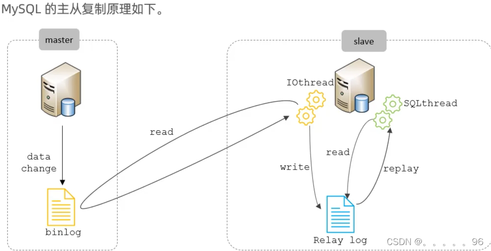 主从复制是指将主数据库的DDL和DML操作通过二进制日志传到从库服务器中,然后在从库上对这些日志重新执行(也叫重做),从而使得从库和主库的数据保持同步。