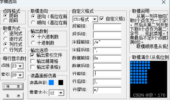 从0开始点亮OLED屏幕(三)OLED画点,显示字符、字符串 而一个数据有8个点,我们可以利用画点函数去显示出来,即画一个点,y坐标加1,画完一个数据后便让x加1画后续一列的8个像素点,此时应该将y的值从新回到一开始的y值,也就是把y0赋过来。size1/8得此字符所占页数,(size1/2)得字符在x的位数,页数乘x方向位数即得出需要写的次数size2。可以发现第三个形参定义的是一个指针,指向要显示的字符串地址,到时显示完一个字符,地址自增,显示下一个字符,在此之前先判断一下是不是合法的字符(是不是可打印显示字符),最小为空格32、最大为'~':126。