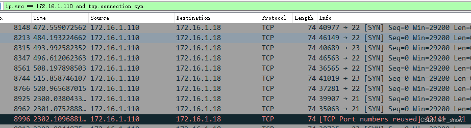 查看端口,这里就要使用过滤语法了,ip.src == 172.16.1.110 and tcp.connection.syn,注意这里说的是暴力枚举,所有80端口不是