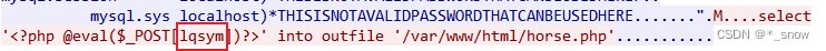 6.继续分析capture.pcapng数据包文件,黑客通过数据库写入了木马,将黑客写入的一句话木马的连接密码作为Flag值提交;