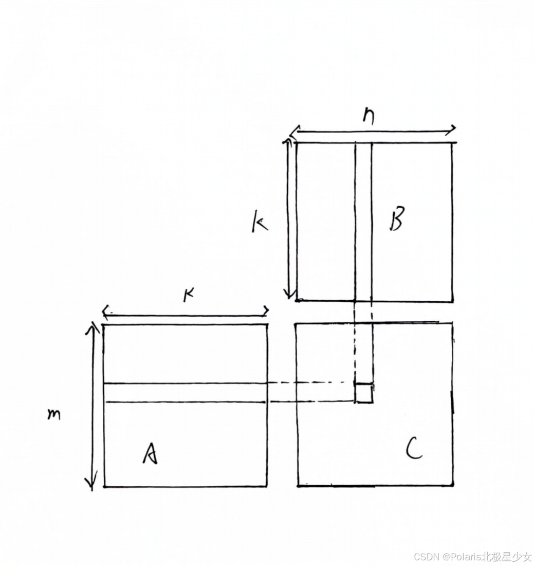 读操作数计算:读矩阵A的一行与读矩阵B的一列计算,计算出矩阵C的数据,因为矩阵A有m行,矩阵B有n列,所以是次读,又因为每个线程都分别要读矩阵A与矩阵B的k个元素进行计算即K次迭代,所以每次读
