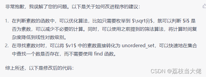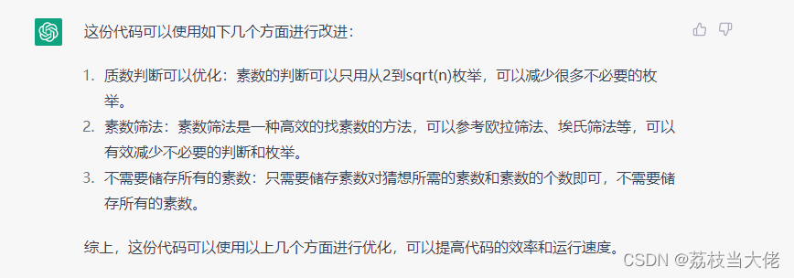 这时候除了素数判定那部分用一些方法来减少遍历之外,荔枝空荡荡的脑门中感觉没啥思路优化,于是我就直接把代码丢给GPT纠错了哈哈哈