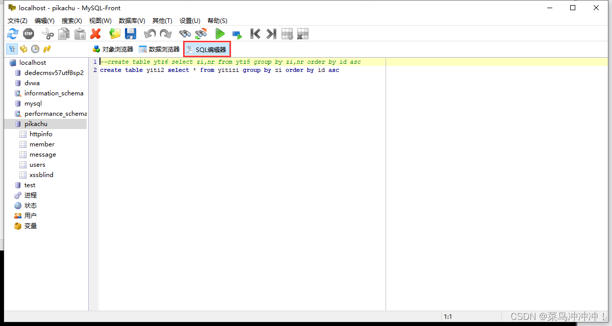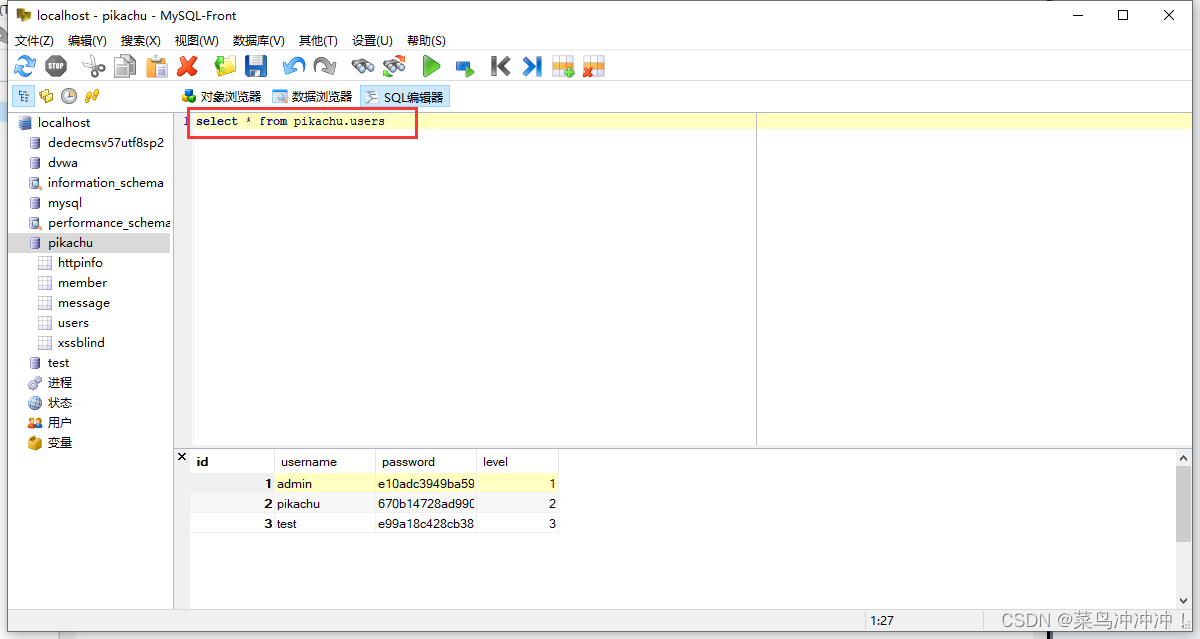 6、再次回到编辑器中尝试输入” select * from pikachu.users where username = "admin" #" and password = md5("123456") “指令,发现也能查询到内容。