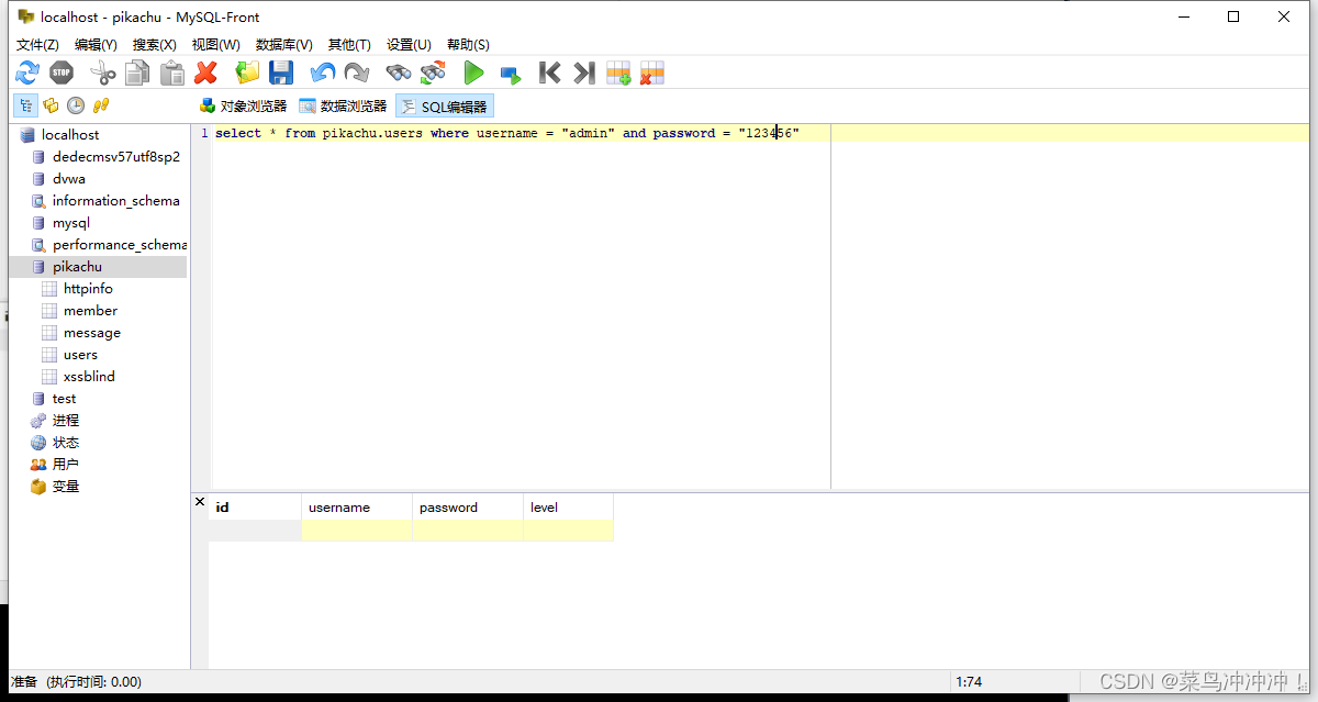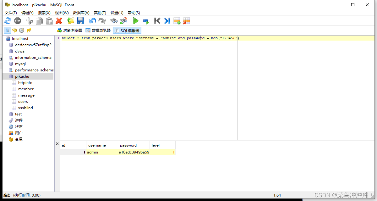 select * from pikachu.users where username = "admin" and password = md5("123456")