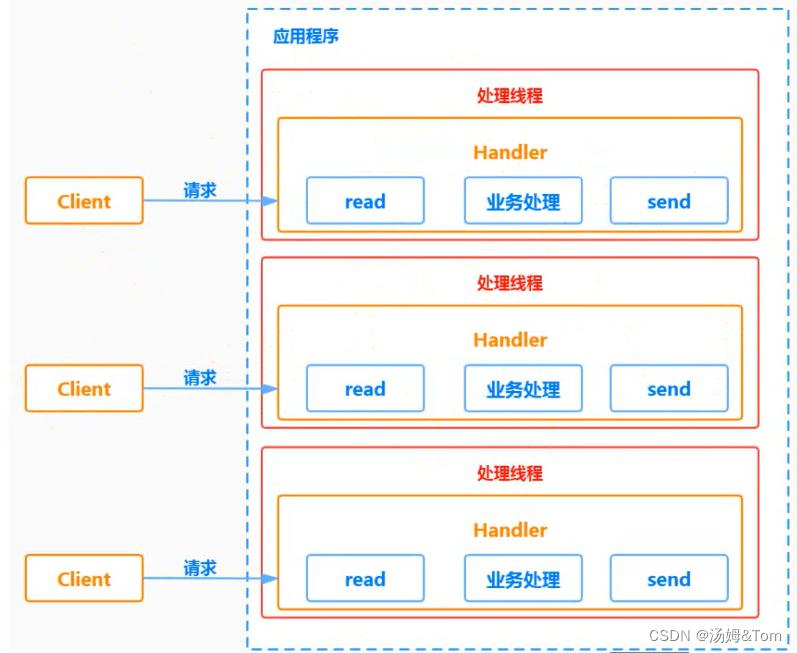 - 每个请求都需要独立的线程完成数据的读写和业务处理