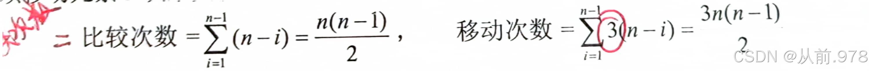 最好情况下,比较次数为n-1,移动次数为0;最坏情况下(初始序列为逆序时),需要n-1趟排序,第i趟排序要进行n-i次关键字比较,每次比较后都必须移动元素3次来交换元素位置。