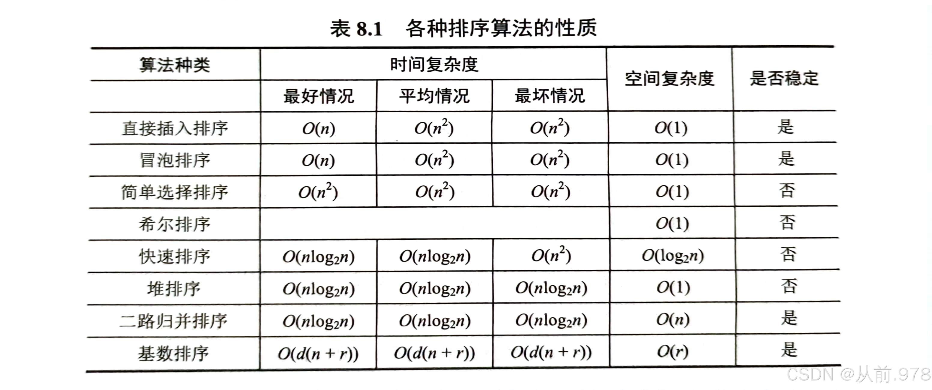 快速排序为O(log n)(以2为底),二路归并排序O(n),基数排序为O(r)。其它为