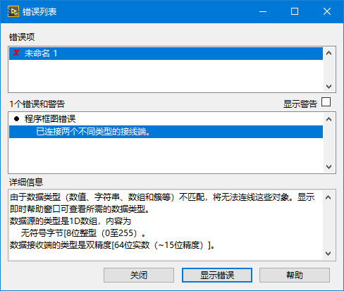 其中数值显示控件,对应的是双精度浮点数,直接相连接会进行报错。