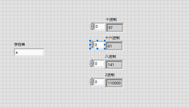 我们一般使用的都是ASCII的方式,将字符转换为数字,然后进而用二进制码所表示。例如我们在labview中进行字符的转换。其中显示面板和程序框图面板如图所示。将字符串转换为无符号数组,所以要将显示控件类型改为数组类型,通过这个转换程序,我们可以清晰的知道字符和其数字之间的对应关系。