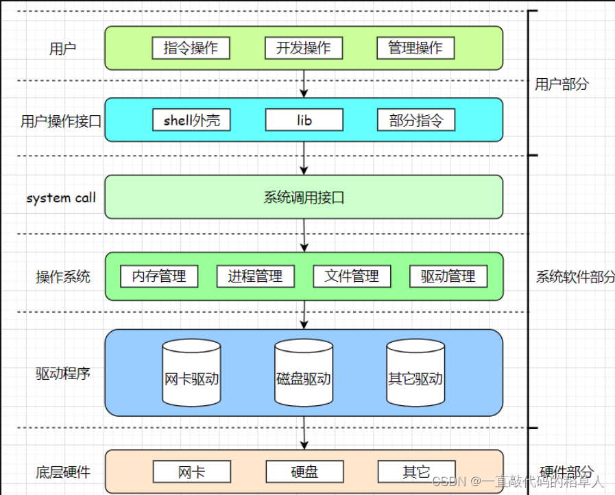 内核(kernel):是整个操作系统的核心部分,负责管理 CPU、内存、磁盘、网络等硬件资源,并为应用程序提供进程管理、内存管理、文件管理、设备管理等功能。