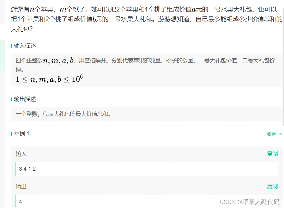 x最大的范围是多少呢?也就是a礼包最多能做多少个,即min(n/2,m)
