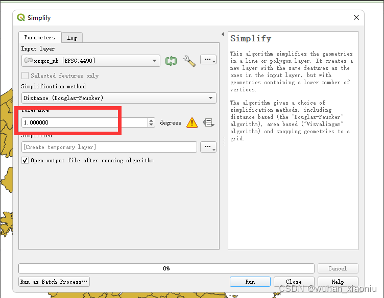 一般我们选择第一个 道格拉斯抽稀 ,如果是地理坐标,区县级别容差我们写 0.0001 , 乡镇级别 我们写 0.00005. 这个参数可以根据抽稀后形变大小,适当调整。