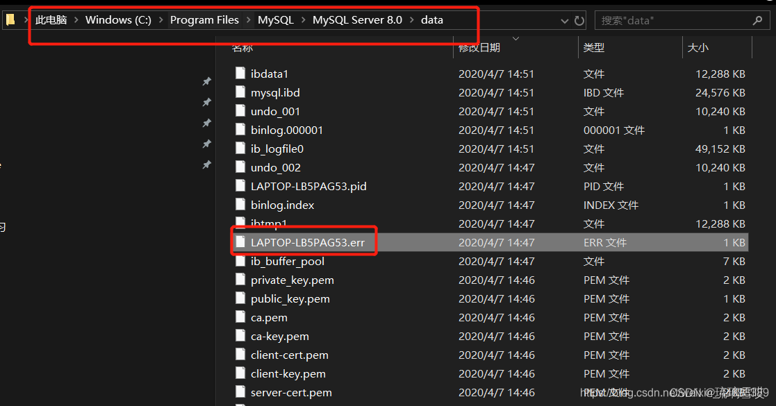 在运行mysql的过程中,也有可能出现其他的错误,这些都可以通过查看data中的.err文件,得到对应的原因。